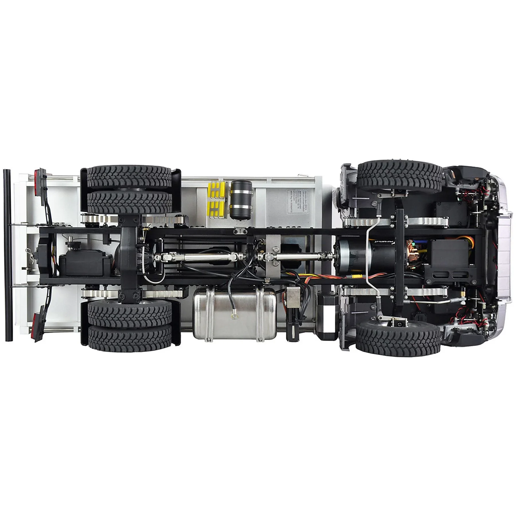 Chassis, Mulde, Antriebsstrang und Wellen bestehen vollständig aus Metall und sorgen für maximale Haltbarkeit. Ein kraftvoller 540er High-Torque Brushed-Motor mit mehrstufigem Getriebe liefert ausreichend Leistung auch auf losem Untergrund. Ergänzt wird das hochwertige Gesamtpaket durch eine sperrbare Hinterachse, schaltbare LED-Beleuchtung sowie eine detailgetreue Fahrerkabine mit vollständig ausgearbeitetem Interieur.
