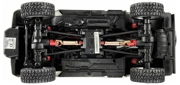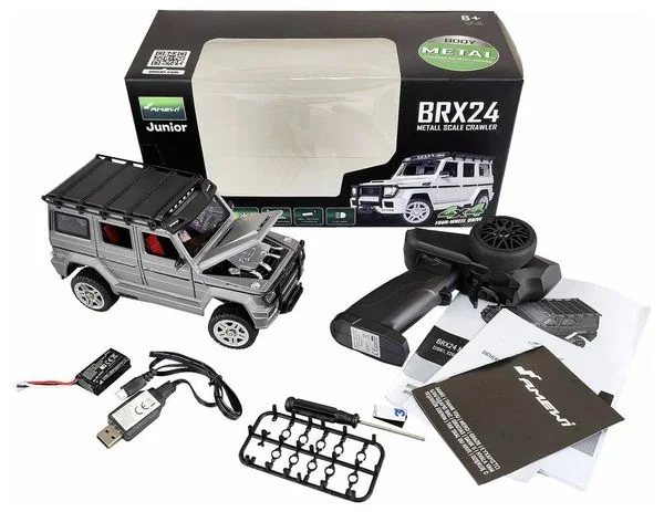Angetrieben wird der BRX24 von einem kräftigen Brushed 4WD-Motor mit Metall-Teleskop-Antriebswellen, einem mehrfach untersetzten Getriebe und gesperrten Differentialen für maximalen Vortrieb. Die profilierten Gummireifen sorgen für optimale Traktion bei jedem Kletter- und Offroad-Einsatz. Alle Türen, die Motorhaube und die Heckklappe (Akkufach) sind funktional, der Innenraum ist detailreich gestaltet.