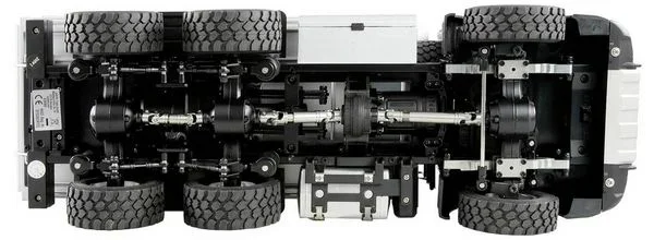 Der Kipper verfügt über einen geländegängigen 6WD-Antrieb mit Metall-Kardanwellen, Federung an allen Achsen und Differenziale für optimale Traktion. Die Metallmulde wird per Schneckengetriebe gesteuert und kann Lasten bis zu 4 kg aufnehmen. LED-Beleuchtung und Soundmodul sorgen für realistische Effekte beim Einsatz.