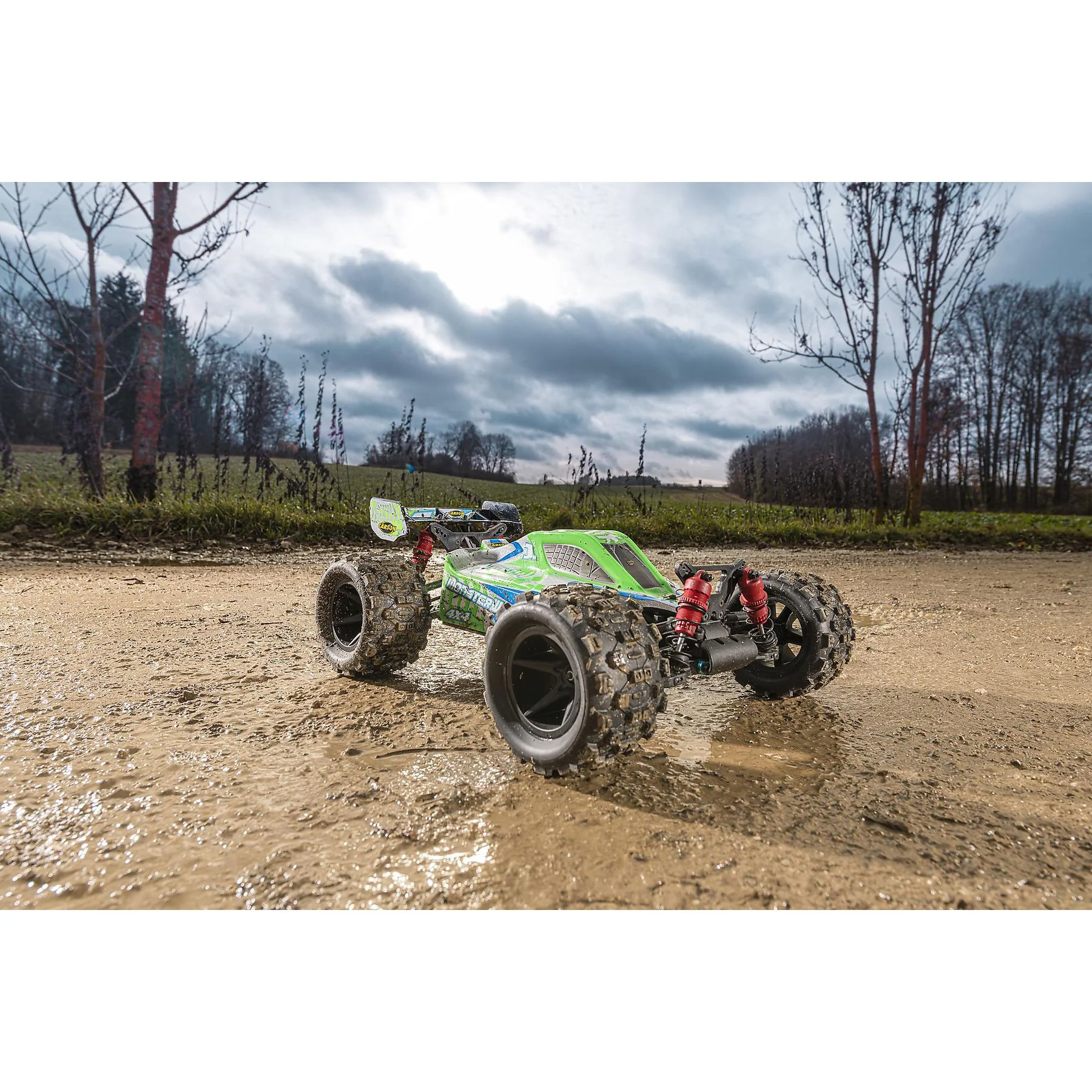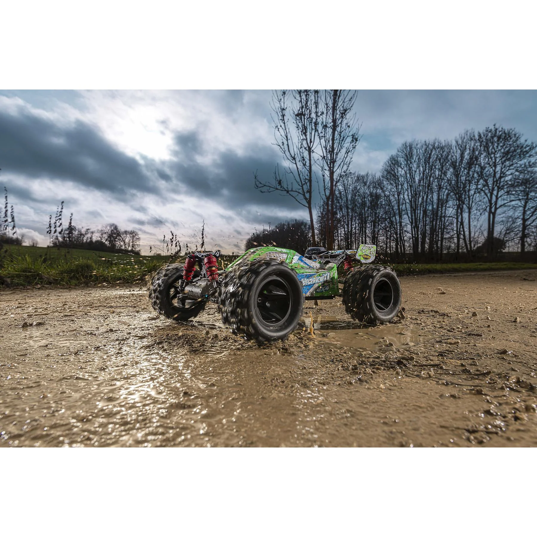 Highlights: Leistungsstarker 550er Motor, Allradantrieb mit Differential, Öldruckstoßdämpfer, wasserfeste RC-Komponenten, geschlossene Zahnradabdeckung, extra breite Monsterreifen, komplett fahrfertig geliefert.