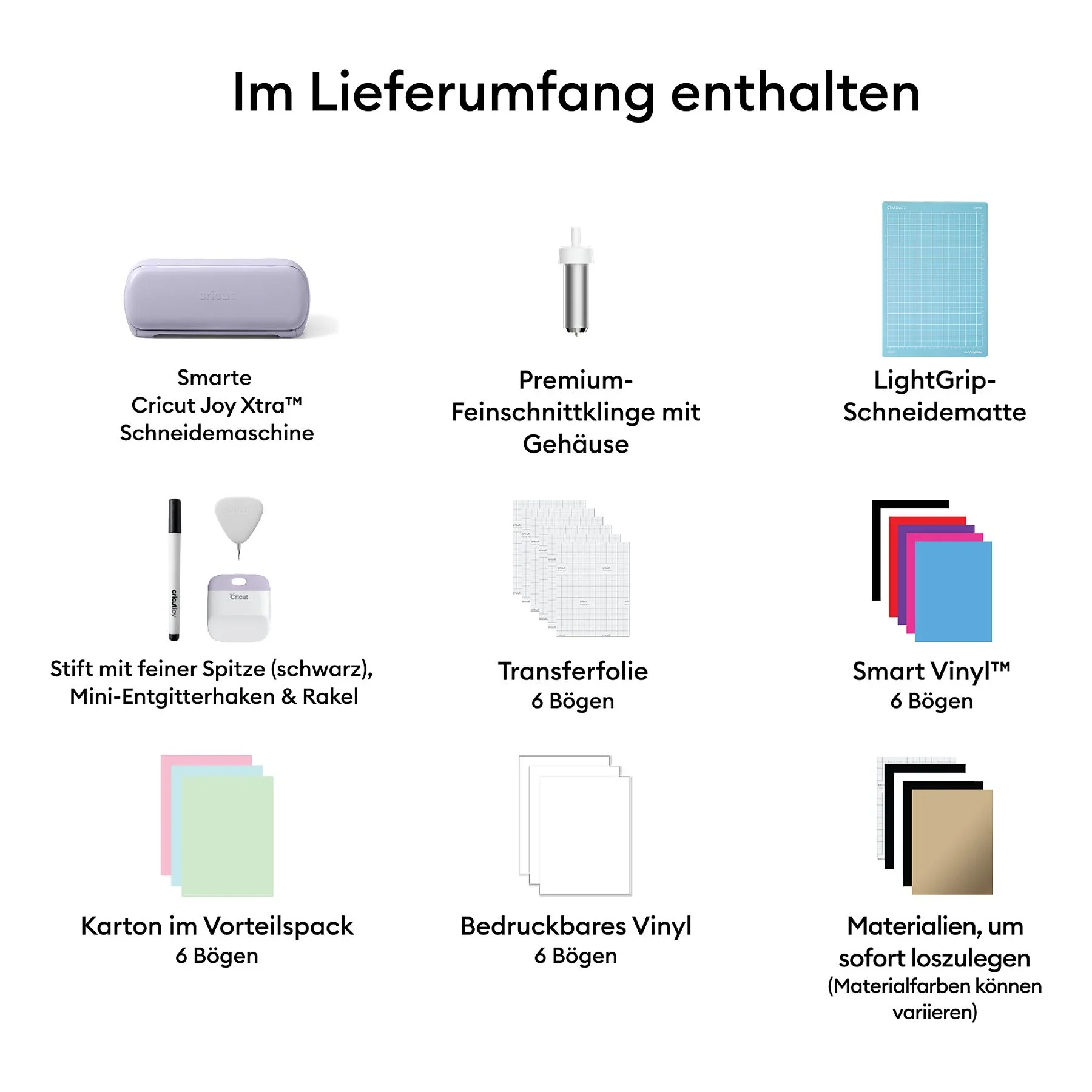 | Im Paket | Cricut Joy Xtra™ Schneideplotter in Lavendel, Premium-Feinschnittklinge mit Gehäuse, Netzteil, Willkommenskarte, Materialien für Testschnitte, LightGrip-Schneidematte, Rakel, Entgitterhaken, Feinstift (0,4 mm), Smart Vinyl™ permanent, Karton-Set, bedruckbares Vinyl, Transferfolie |