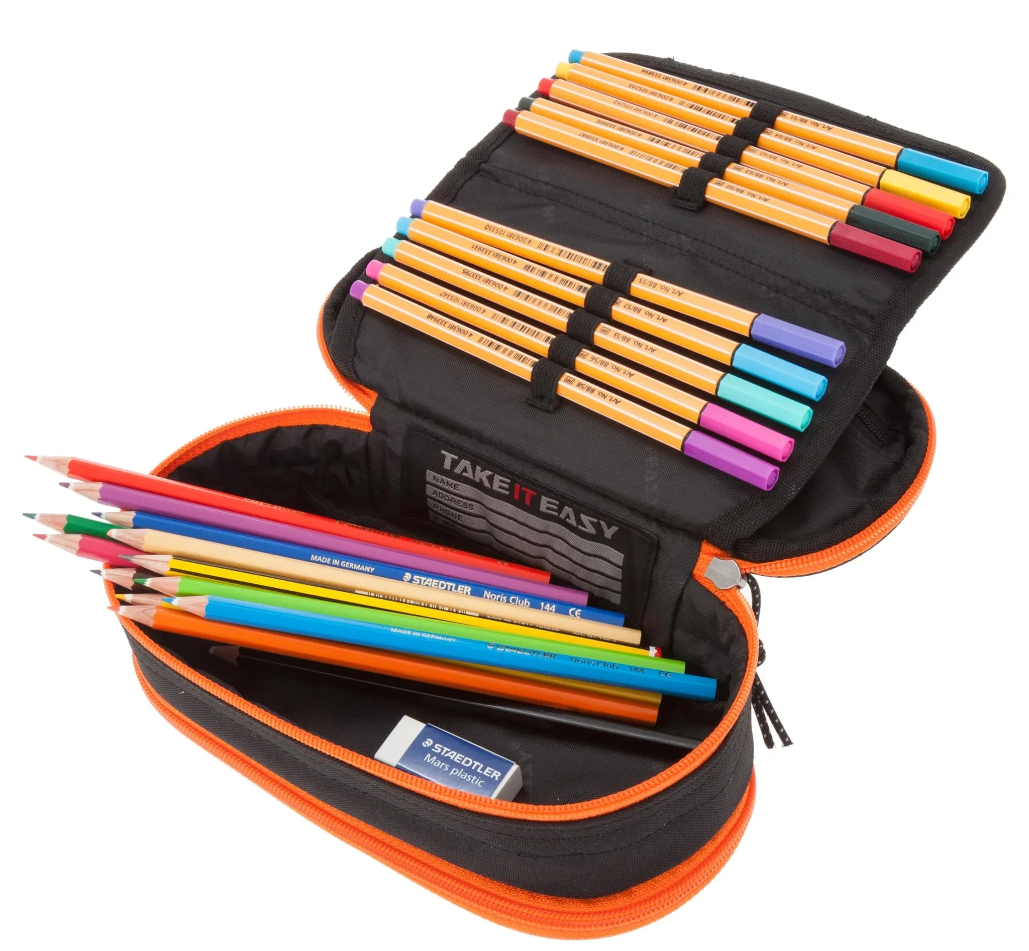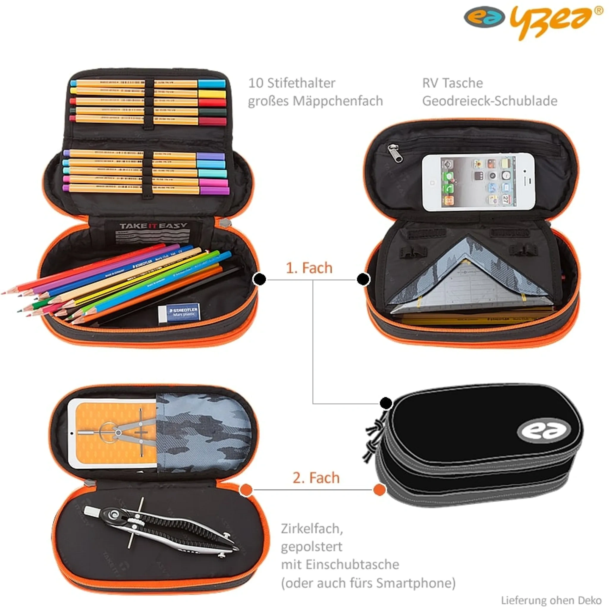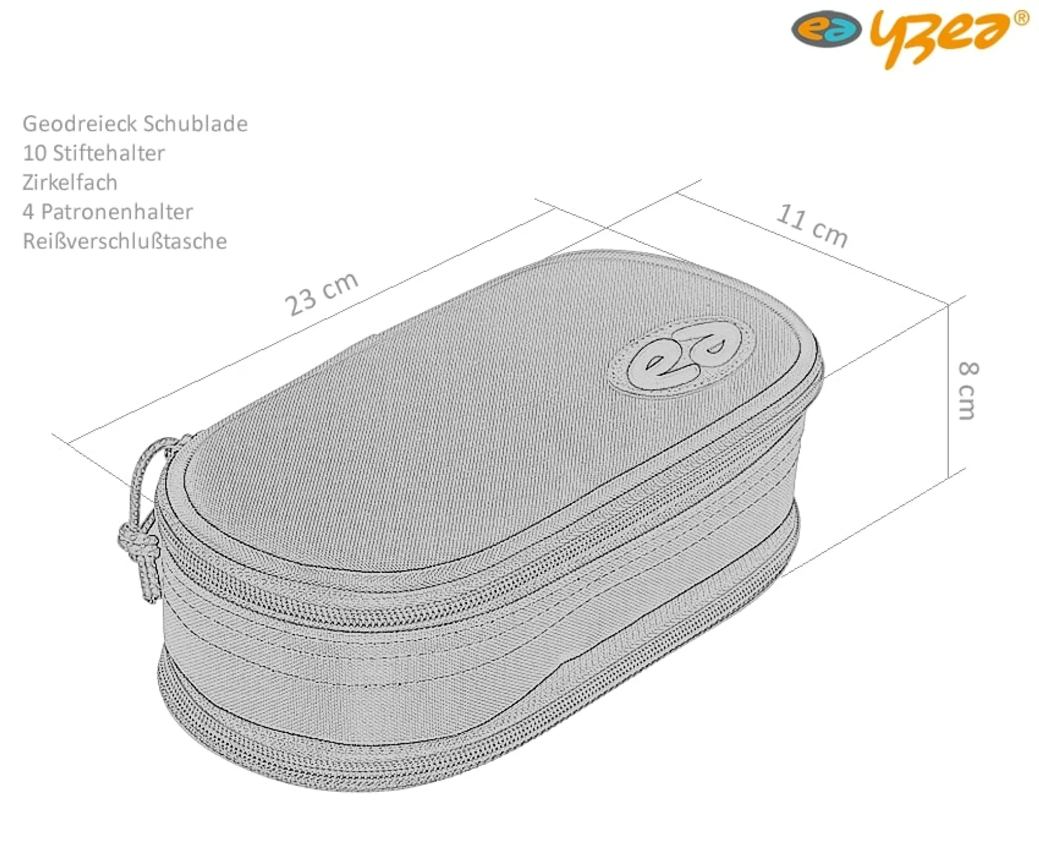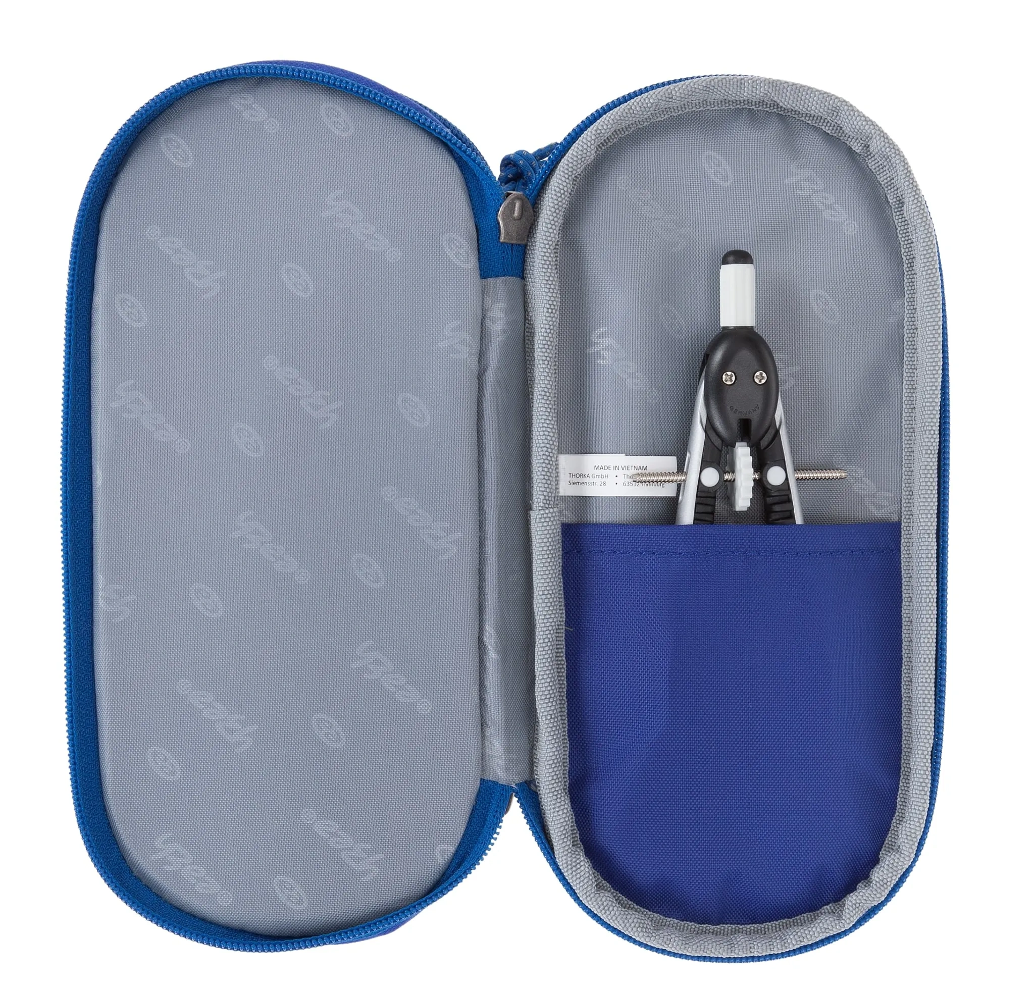 Innen sorgen zahlreiche Fächer und Halterungen für Stifte, Geodreieck, Zirkel oder Schere für perfekte Ordnung. Ein separates Reißverschlussfach bietet Platz für Smartphone oder kleine Utensilien. Ideal für Kinder und Jugendliche, die Wert auf Übersicht und Qualität legen.