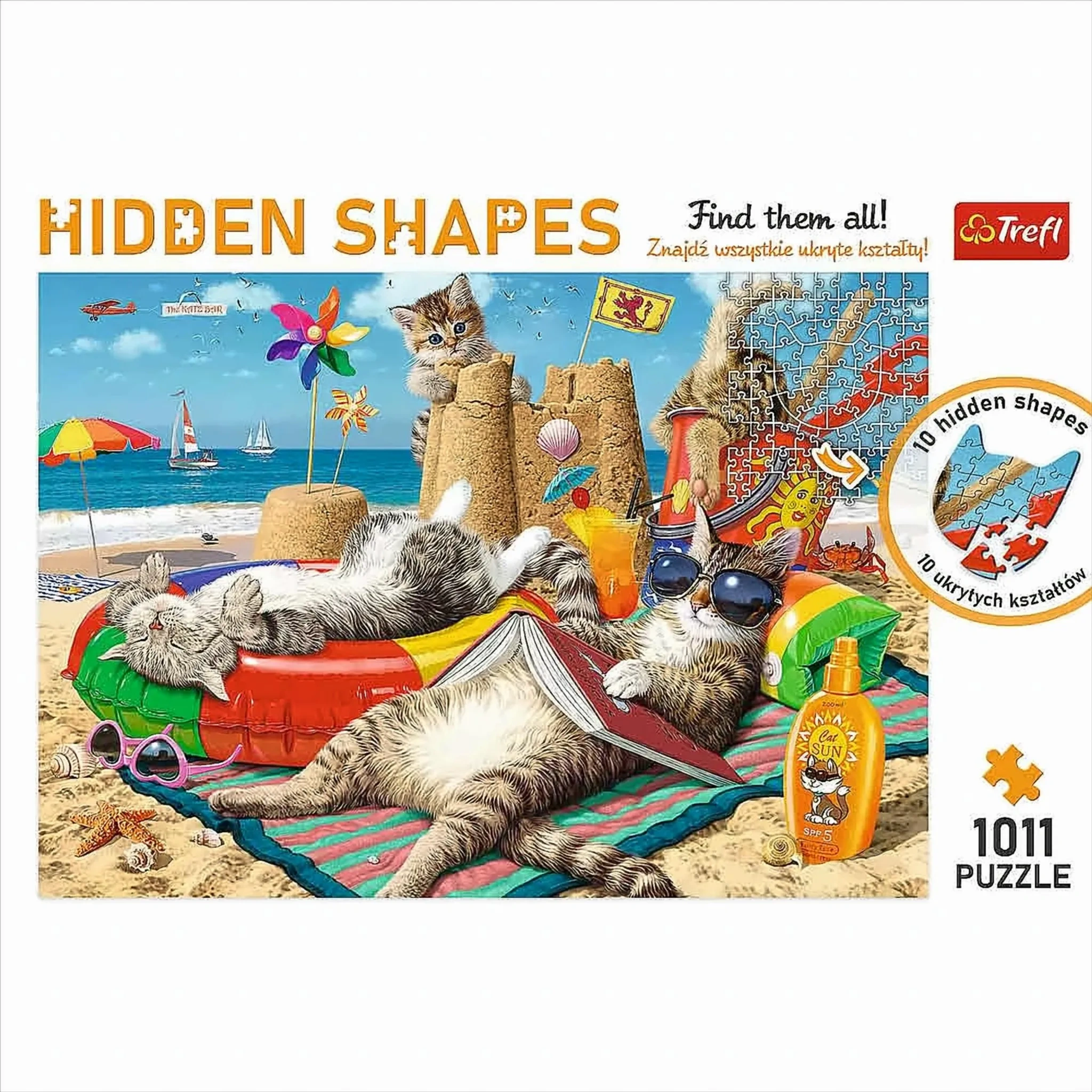 Das „Hidden Shapes: Katzenurlaub“ Puzzle von TREFL bietet ein außergewöhnliches Puzzleerlebnis mit doppeltem Spaß. Im farbenfrohen Katzenmotiv verbergen sich 10 einzigartige Formen, die erst sichtbar werden, wenn das Puzzle vollständig zusammengesetzt ist. Diese versteckten Elemente machen das klassische Puzzeln zu einer spannenden Entdeckungsreise für Groß und Klein.